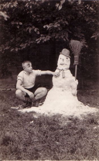 (sbr) Um 1938: Klaus Trümper hat mitten im Sommer einen Schneemann gebaut - mit dem Eis und Reif, der sich bei der Eisherstellung auf den Kühlrohren im Hildesheimer Eiswerk Trümper, Steinbergstraße 110, gebildet hat. Das Foto hat Kuddel Laue in Hannover zur Verfügung gestellt.